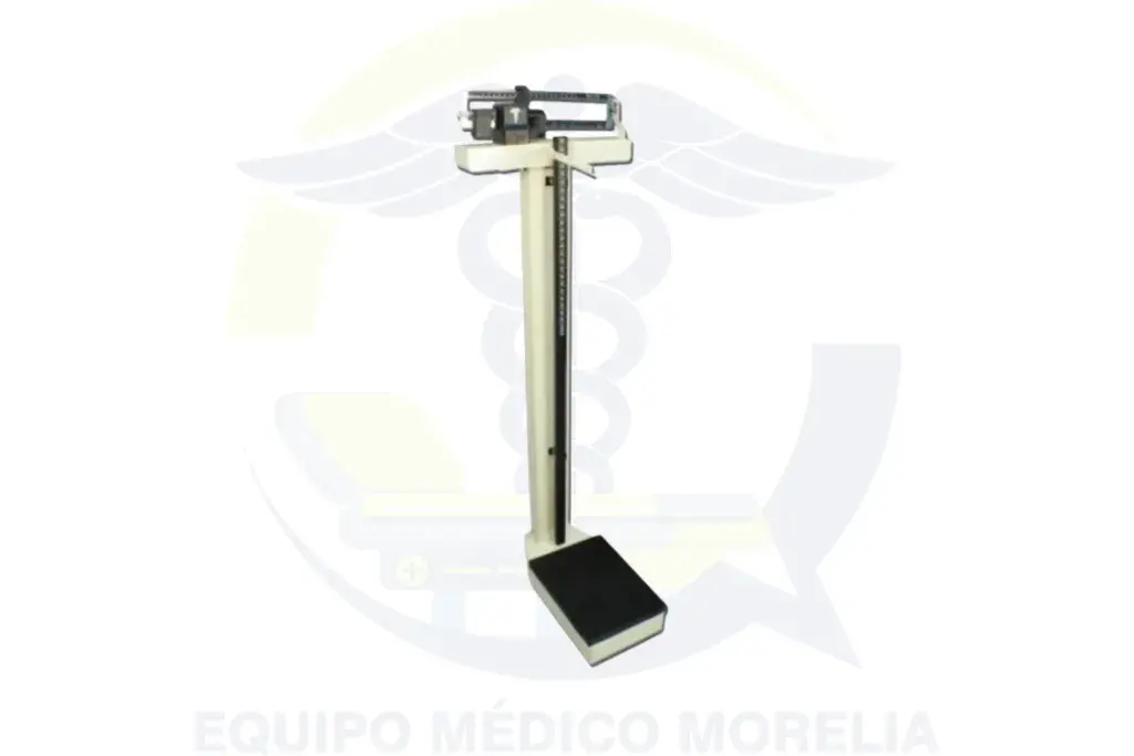 Báscula mecánica para consultorio con plataforma fabricada en acero y estadímetro de 2 metros, ideal para control de peso y talla en clínica.