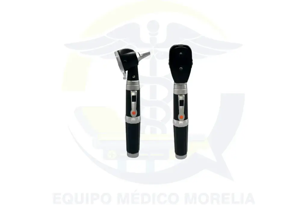 Kit de diagnóstico ORL/oftálmico con otoscopio y oftalmoscopio, ideal para exploración de oído y ojo en consultorio, con accesorios para una evaluación completa.
